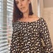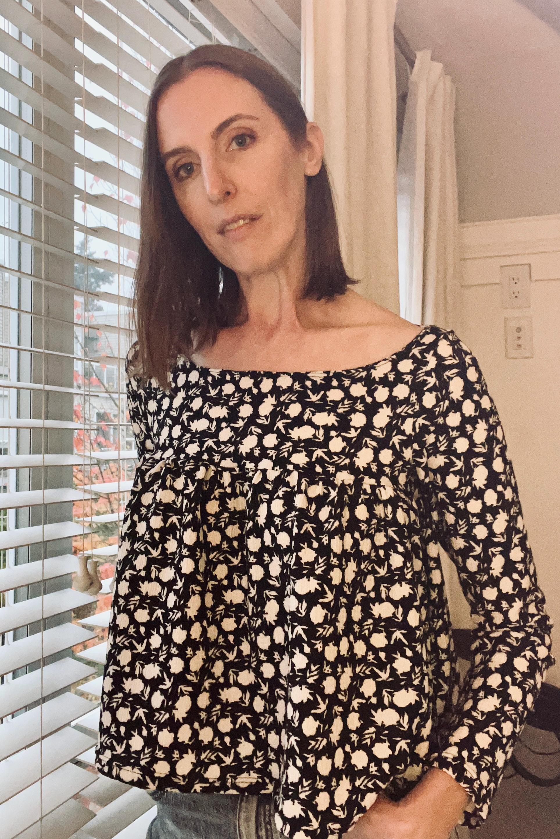 Long sleeve, black and white floral top with a gathered tier and wide neckline. Made with comfy, stretchy fabric. Perfect for fall/winter outfits.